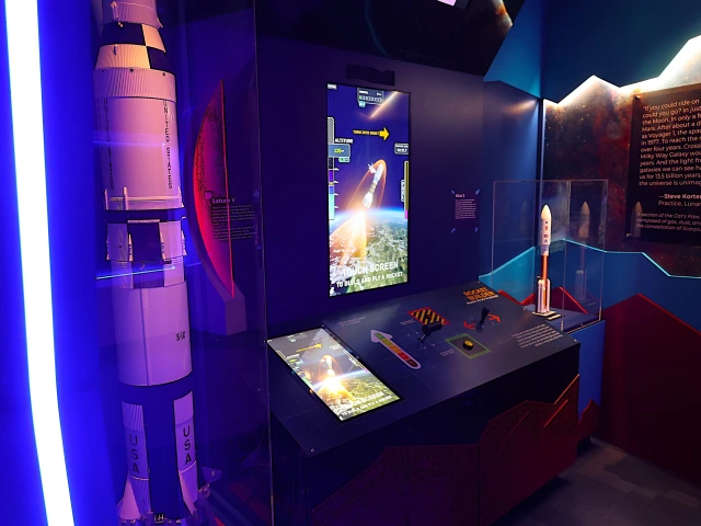 Once in the exhibit proper, you'll find an opportunity to build a simulation of a multi-stage rocket launch. Engineer your own launch sequence to low Earth orbit or all the way to Mars.