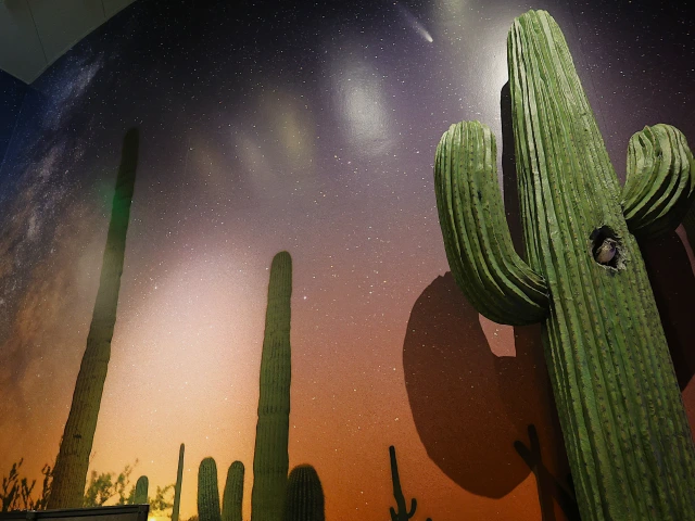 As approach the entrance to the exhibit, you'll be greeted by a 18 ft. tall sculpture of a saguaro cactus with a built-in bench at the base and a huge print of one of accomplished night-sky photographer Sean Parker's starry night photos.